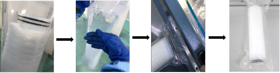 Rinse the pre-wetted packaging bag multiple times with ultrapure water. Place the rinsed filter cartridge into the packaging bag with the outlet facing upward. Seal the bag at a position 10–20 cm above the filter cartridge outlet.