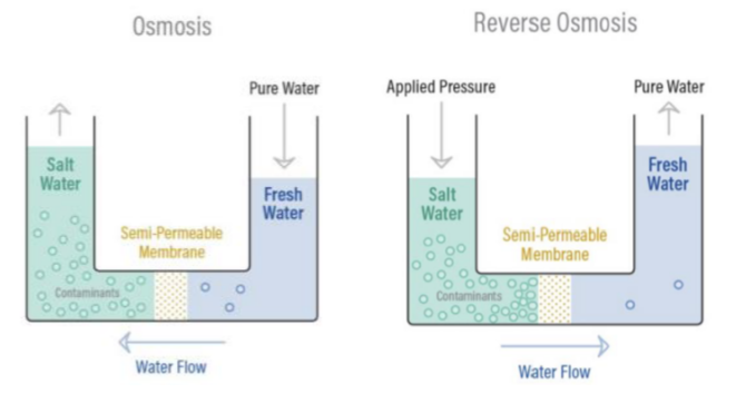 In reverse osmosis, applying pressure greater than the osmotic pressure forces water to move in the opposite direction—from the high-concentration side to the low-concentration side—effectively filtering out contaminants. The membrane that facilitates this process is known as a reverse osmosis membrane.