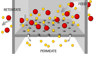 The filtration sterilization process uses porous membrane filters with membranes such as nylon, polyvinylidene fluoride (PVDF), or polyethersulfone (PES). The pores in the membranes are of differing sizes that prevent any substance larger than the size of the pore from passing through. The smaller the pore, the more effective the filter is at preventing substances from going through to the other side of the filter. In the diagram, the larger, red particles are not able to pass through the pores in the filter. The smaller, yellow particles, however, pass through to the other side of the filter.