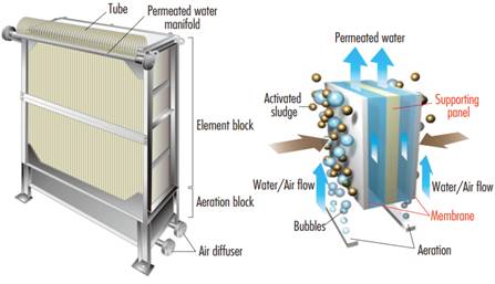 MS submerged PVDF flat sheet membrane module configuration comprises an element block and an aeration block. The element block contains a number of membrane elements stacked at equal intervals, each of which has flat sheet membranes attached on both sides of a supporting panel. Each element is connected via a tube to a permeated water manifold. The aeration block consists of air diffusers used to supply air.