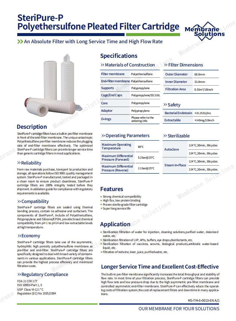 MS polyethersulfone (PES) pleated filter cartridge is an industrial filtration high-precision filter cartridge composed of PES filter membrane + upstream and downstream support and drainage + inner and outer skeleton + end caps at both ends + adaptor + sealing material; it has ultra-low protein binding and dissolution/precipitation level, uniform pore size distribution, excellent bacteria retention capacity, excellent high initial flux. In addition, the PES pleated filter cartridge strictly controls the production environment during the production process to ensure the quality and high cleanliness of the filter cartridge. Based on the original high-performance PES (polyethersulfone) membrane, MS polyethersulfone (PES) series filters cartridges combine different local application scenarios, and carry out refined design of their configurations to form different sub-series, to meet the needs of different customers for products, such as SteriPure, SteriPure-B and SteriPure-P, etc. Each series has different characteristics and applications, and we can choose the appropriate PES pleated filter cartridge for you according to your needs.