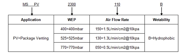 | Part No. | Material | WEP(mbar) | Air Flow Rate (L/min/cm2@10kpa) |