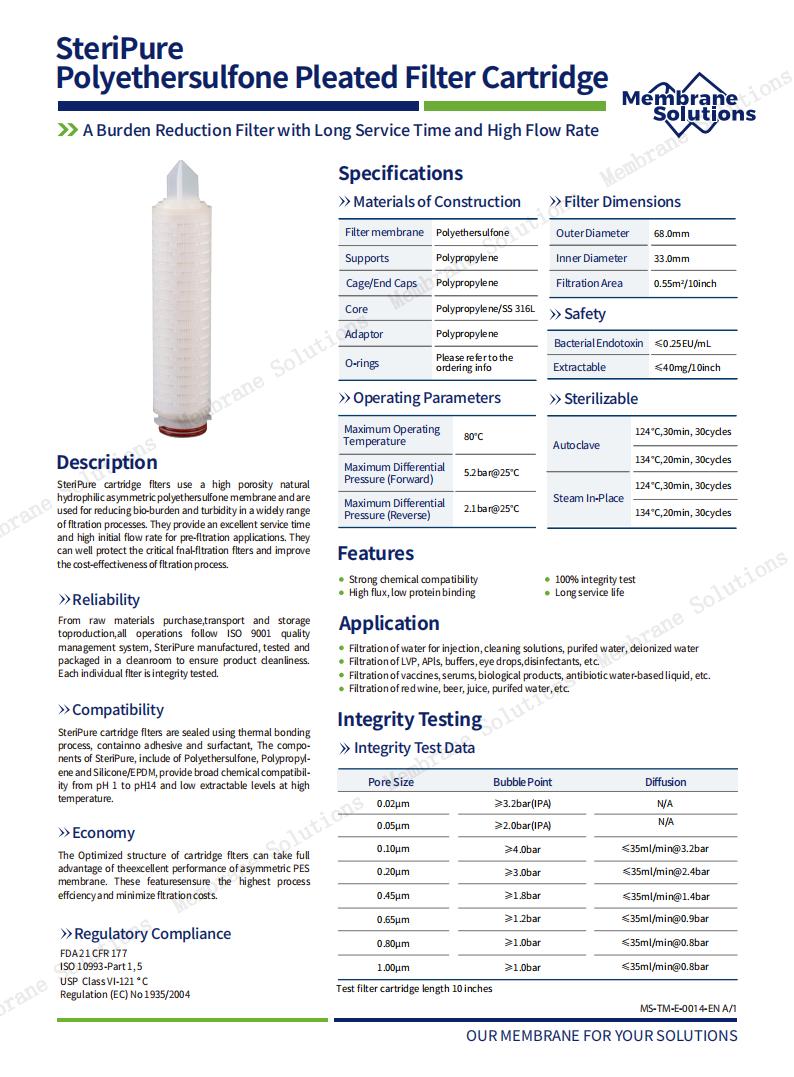 SteriPure Series PES Pleated Filter Cartridge with High Flow Rate and Long Service Life